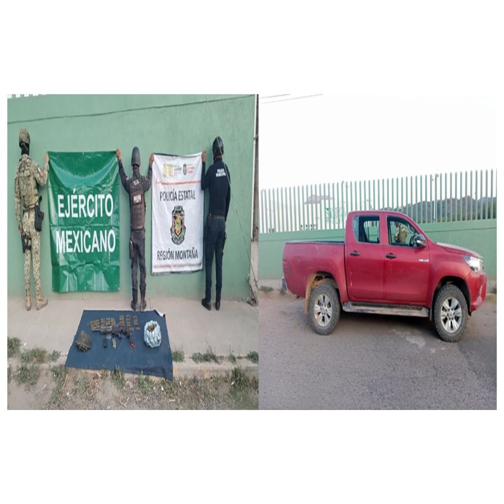 Durante recorridos de vigilancia en la comunidad de El Refugio, un operativo interinstitucional logró asegurar armamento, presunta droga y un vehículo con reporte de robo en el municipio de Olinalá.